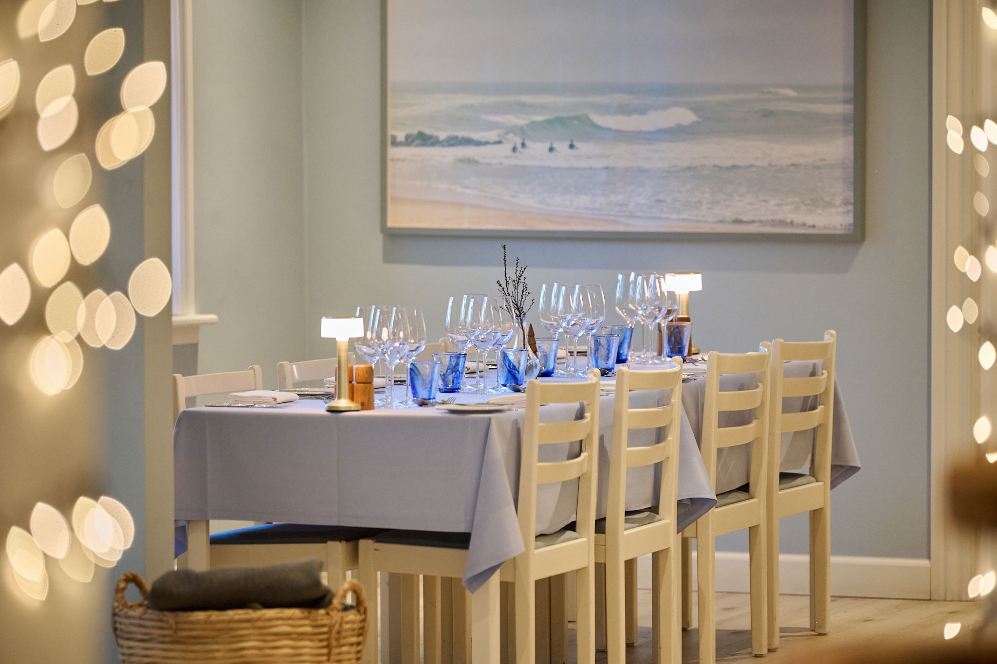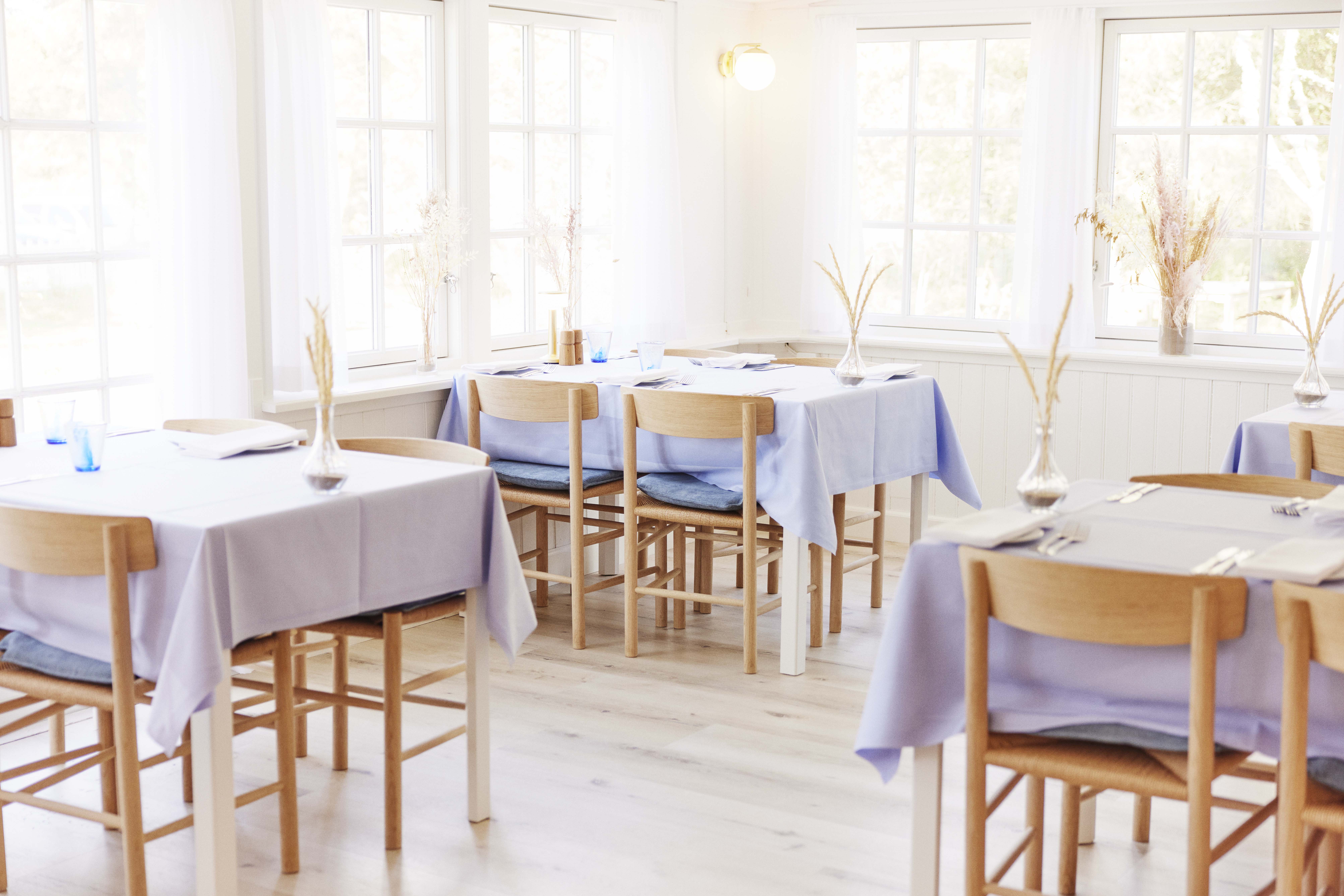 Når I træder ind i restauranten, skal der ikke meget til at forestille sig, at nogle af karaktererne fra den populære tv-serie, Badehotellet, allerede sidder ved deres stamborde klar til at indtage aftenens middag ved de lavendelblå duge med simpel, stilren borddækning.
